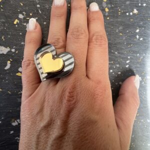 Θηλυκό με έντονο δυναμισμό που συγκλονίζει, το δαχτυλίδι αυτό μαύρης μεταλλικής χαραγμένης βάσης και χρυσής επιφάνειας σε σχήμα καρδιάς θα αιχμαλωτίσει τις αισθήσεις σας και θα δώσει έναν σκοτεινό ερωτισμό στο στυλ σας.